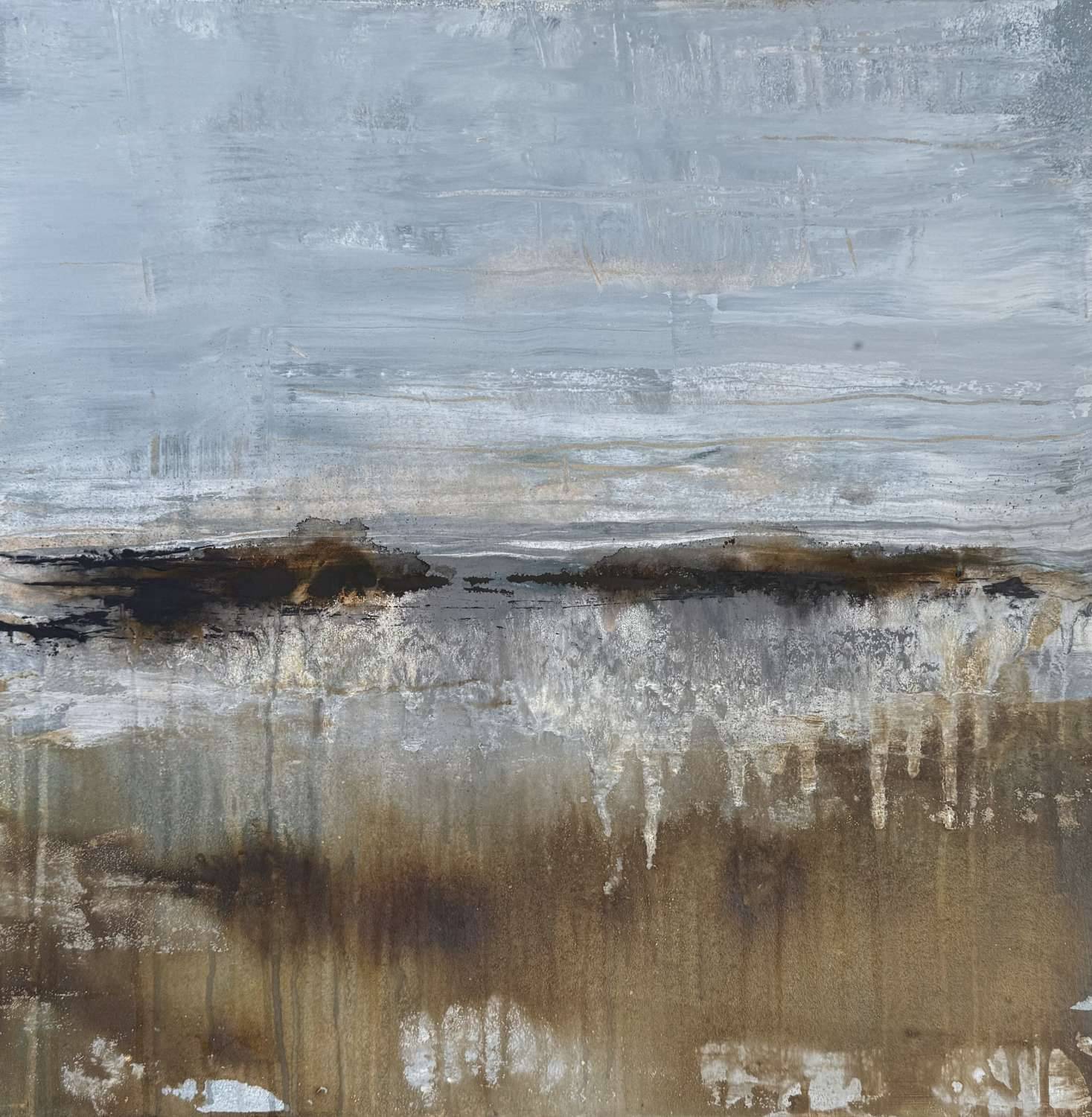 Quiet Earth captures the understated drama of an open landscape on the edge of memory. The muted sky meets textured earth tones in layered sweeps and drips, evoking peat bogs, marshland or fields after rain. The intentional blending and soft erosion between sky and ground suggests both passage of time and natural decay.